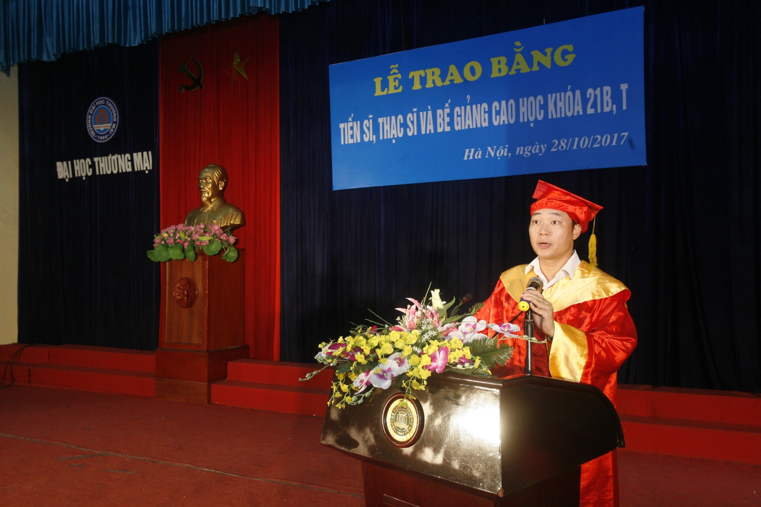 Thay mặt lãnh đạo Nhà trường, PGS.TS Nguyễn Hoàng Long - Phó hiệu trưởng Nhà trường chúc mừng các học viên cao học, nghiên cứu sinh đã hoàn thành khóa đào tạo, biểu dương và ghi nhận sự cố gắng, nỗ lực của các học viên cao học, nghiên cứu sinh đã khắc phục mọi khó khăn, hoàn thành tốt chương trình đào tạo và chính thức trở thành những Tiến sĩ, Thạc sĩ của Trường Đại học Thương mại, góp phần vào việc thực hiện thắng lợi mục tiêu, nhiệm vụ của Nhà trường cũng như khẳng định uy tín, chất lượng đào tạo của Trường Đại học Thương mại. Thầy Phó Hiệu trưởng tin tưởng với những kiến thức đã tiếp thu tại Nhà trường, các tân Tiến sĩ, tân Thạc sĩ sẽ áp dụng tốt vào trong quá trình công tác, góp phần xây dựng đất nước ngày càng phát triển vững mạnh.
