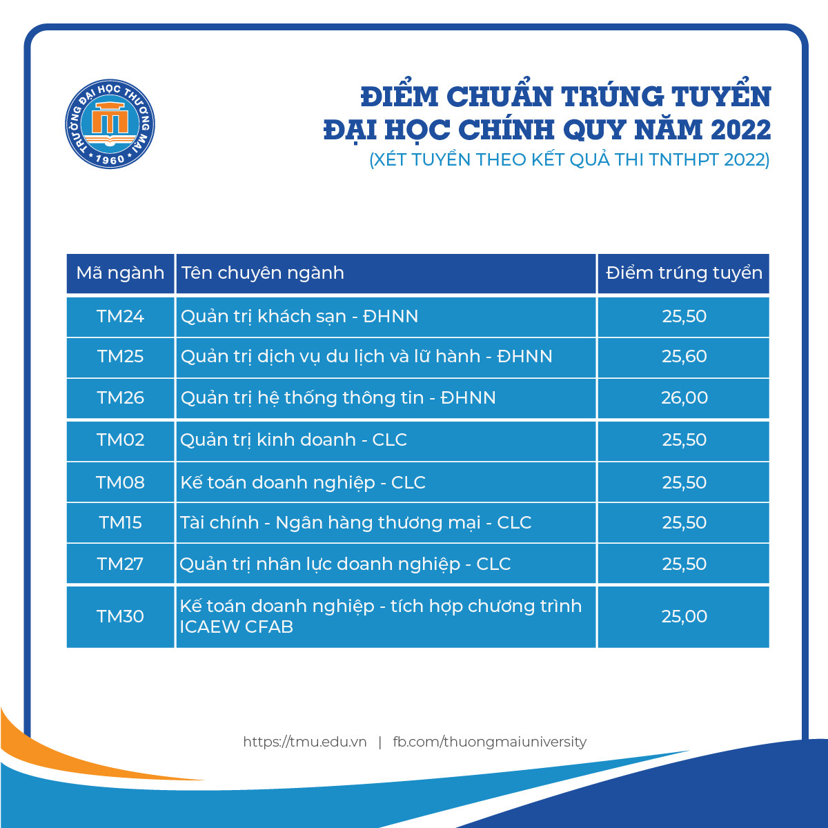 - Căn cứ Thông báo số 908/TB-ĐHTM-HĐTS ngày 24/7/2022 của Hiệu trưởng Trường Đại học Thương mại về ngưỡng đảm bảo chất lượng đầu vào kỳ tuyển sinh đại học chính quy năm 2022;